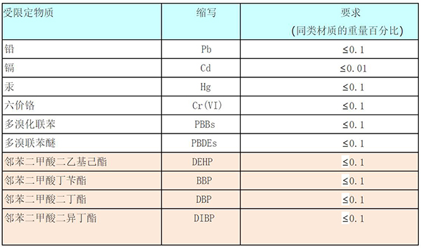ROHS 2.0测试项目如下: